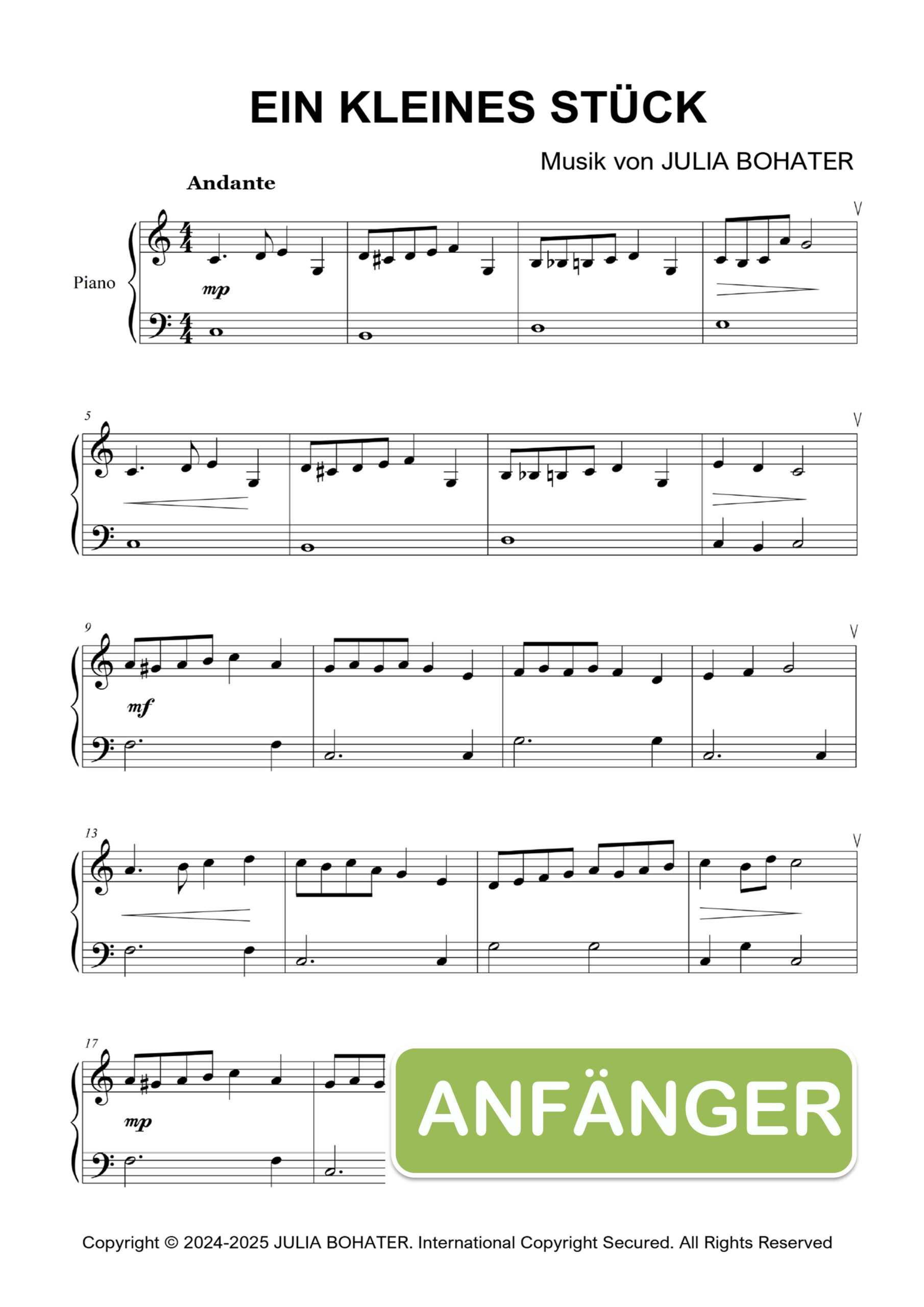 Ein kleines Stück (Teil 1) ist eine charmante 2-seitige Komposition von Julia Bohater, ideal für junge Lernende und Schüler, die ihre Klavierreise beginnen.“ 🎶