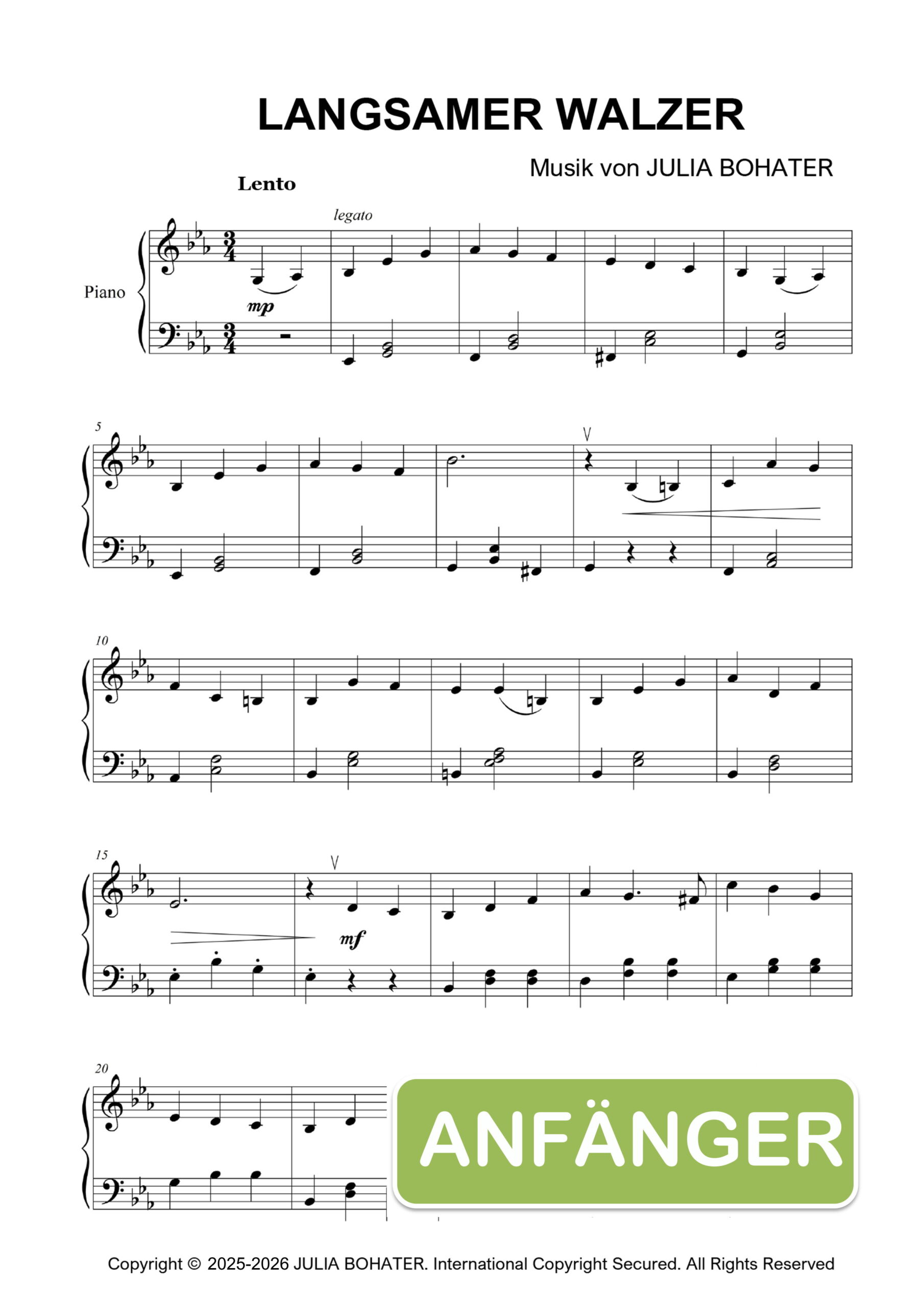 Langsamer Walzer (Teil 1) ist ein lyrisches 2-seitiges Stück von Julia Bohater – ideal, um Eleganz, fließende Melodie und den sanften Walzerrhythmus zu üben.“