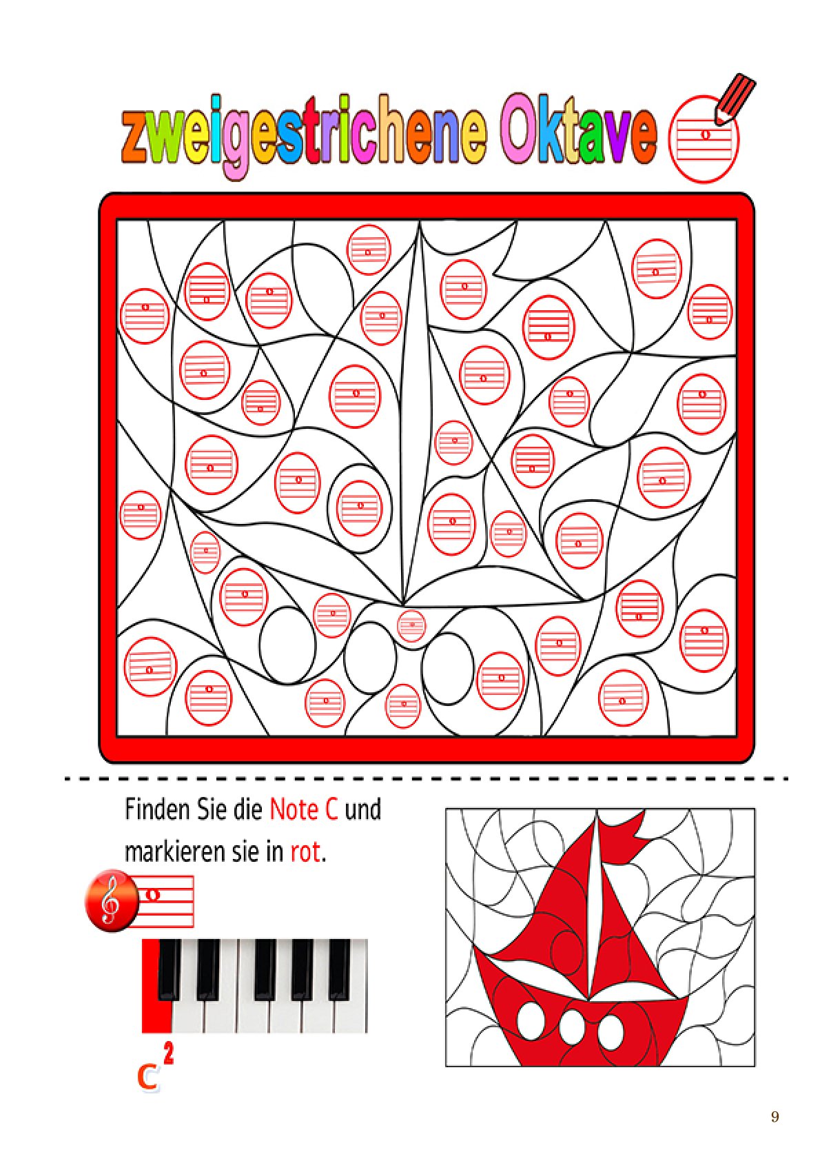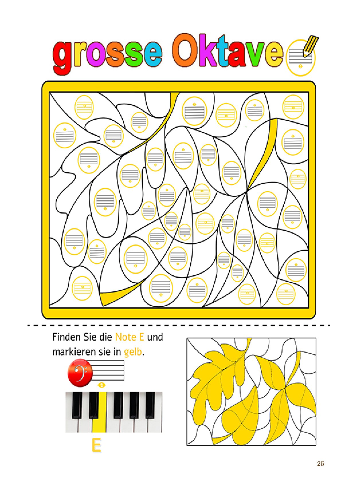 🌟 Spielerischer Ansatz: Das Kind sucht unter vielen „musikalischen Blasen“ die richtige Note und färbt sie in der angegebenen Farbe aus. So wird die Aufmerksamkeit geschult und das Lernen lebendig und dynamisch.