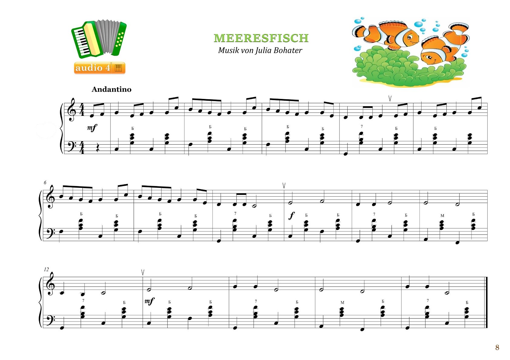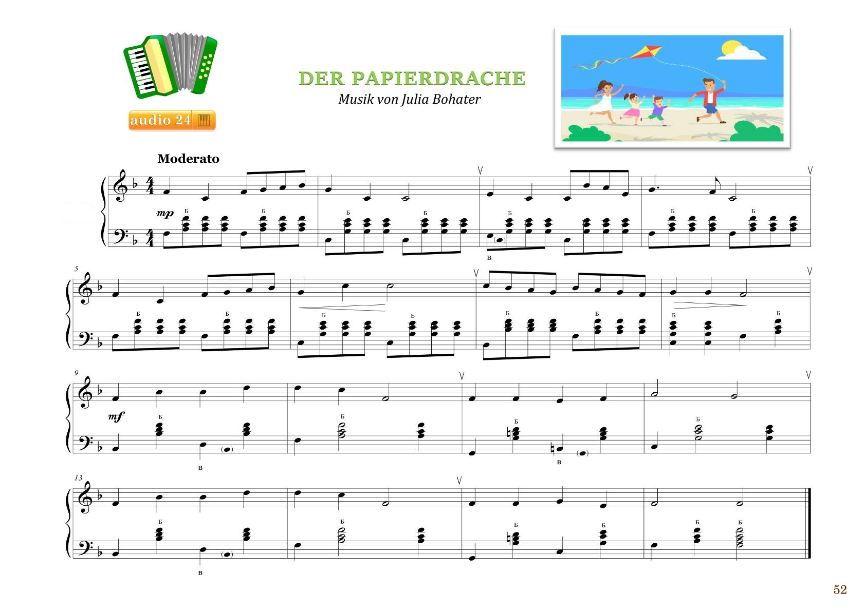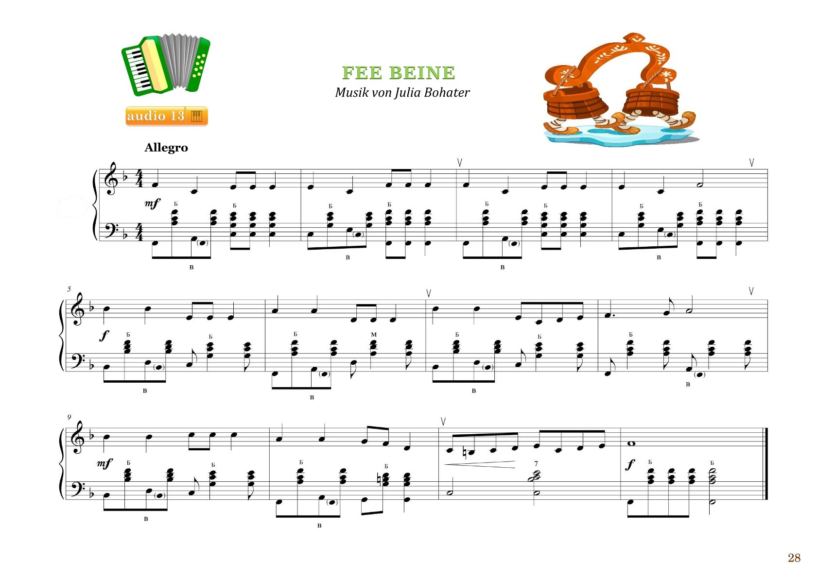 „Regenbogen. Der kleine Musiker. Niveau 2“ ist eine Sammlung mit 26 farbenfrohen Stücken für Akkordeon, begleitet von MP3-Playbacks in den Formaten Plus (mit Melodie) und Minus (nur Begleitung) in vier Tempi – vom langsamsten bis zum Konzerttempo.