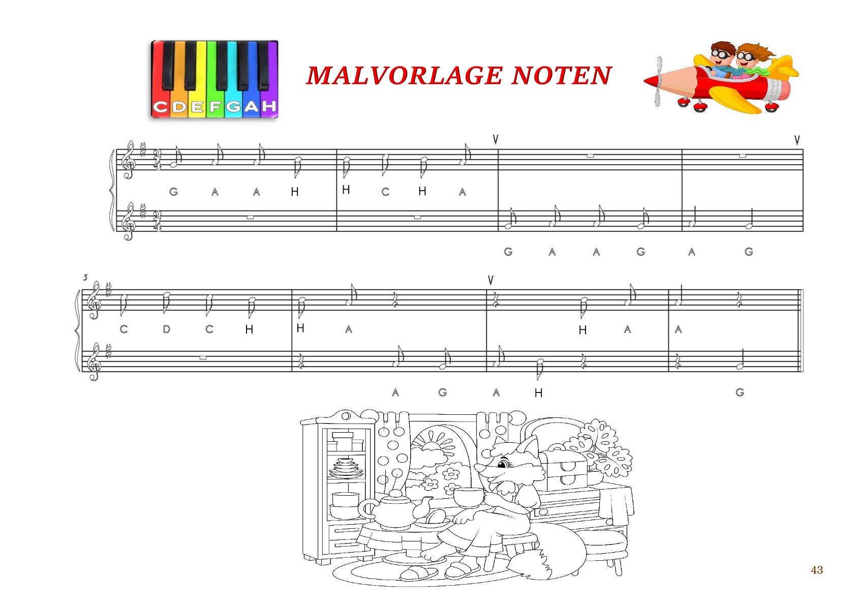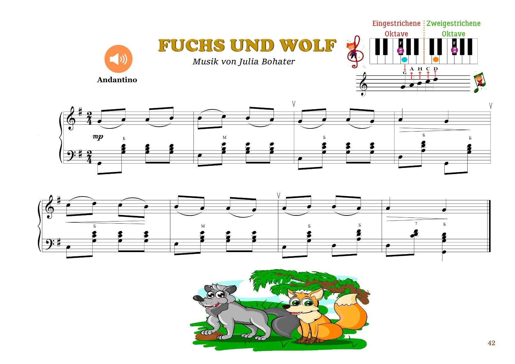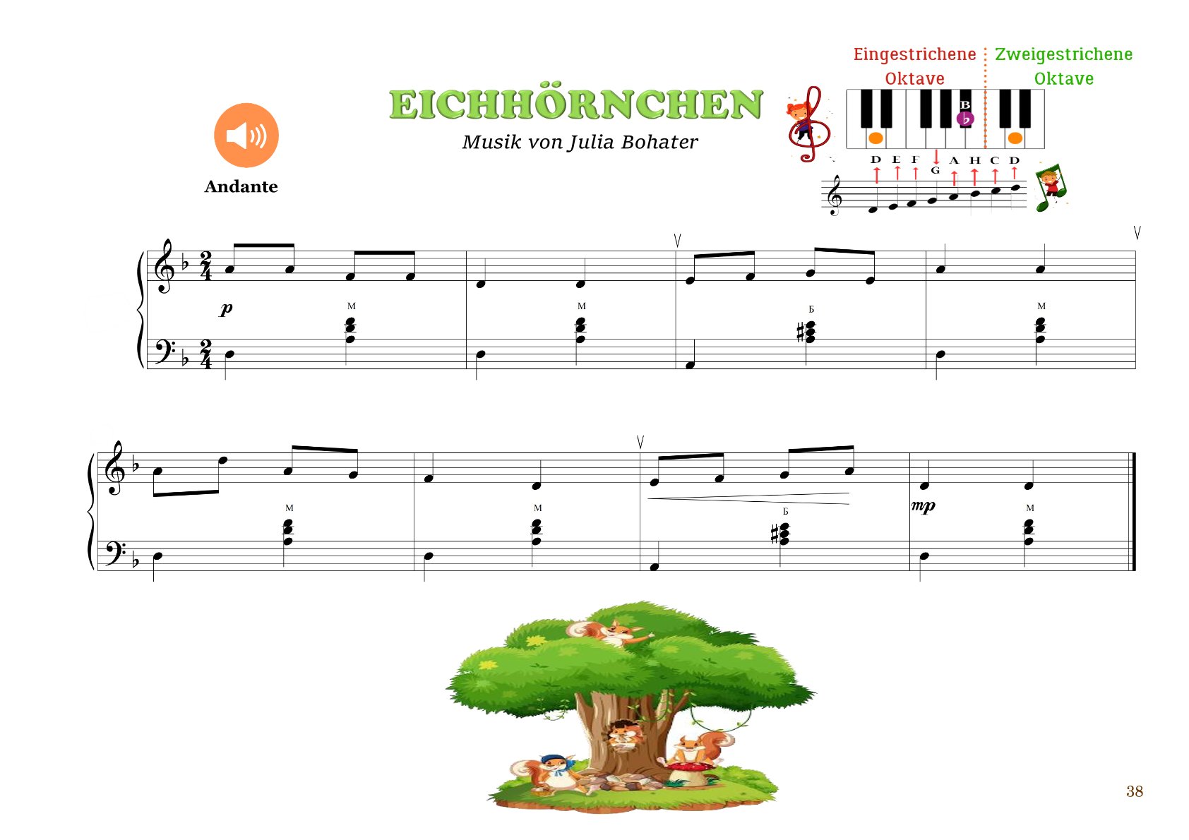 Farbenfrohe Illustrationen von Waldbewohnern fügen ein spielerisches Element hinzu und helfen, Melodien und Akkorde besser zu behalten. Das Lernen wird dadurch lebendig und spannend. 🦊🌲